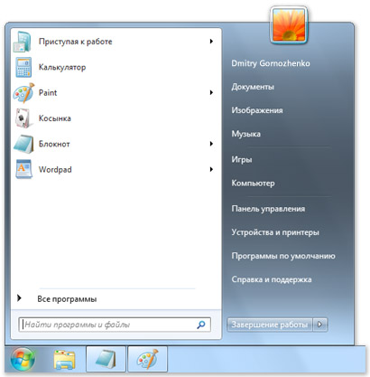 Для такого, чтобы работать в операционной системе Windows 7, следует знать устройство меню Пуска, которое состоит из двух вертикальных колонок, отличающихся между собой по цвету. С левой стороны меню Пуск расположен список наиболее часто используемых программ, а также строку поиска системы. Вторая колонка обладает более темным цветом и содержит основные ссылки на папки ПК, а также некоторые программы для настройки системы.