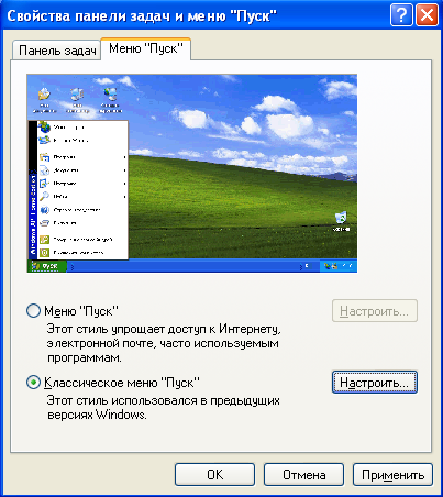 Выбираем "Класическое меню Пуск", и нажимаем кнопку Настроить. (Не волнуйтесь, мы потом нажмем "Отмена", так что вы можете сохранить стиль меню XP)